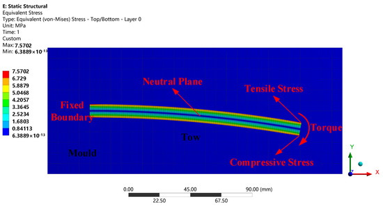 Firstly, the internal stress model of the tangential contact surface is verified. The laid edge of the prepreg tow is set as a fixed boundary, and a torque of 1 N·m is applied to the edge to be laid. Cohesive contact elements are established between the tow and the mold, and the equivalent stress simulation result (Figure 9) is 7.5702 MPa. The theoretical value of the maximum in-plane load (boundary load) calculated according to the functional relationship between torque and stress Equation (17) is 7.4590 MPa, with an error of about 1.47% compared with the simulation result. It can be seen from the mesh diagram that there is a neutral plane with a stress and strain state of 0 at the middle position of the prepreg tow subjected to traction rotation torque, and the tow on both sides of the neutral plane is in compression and tension states, respectively, and is symmetrical with respect to the neutral plane.