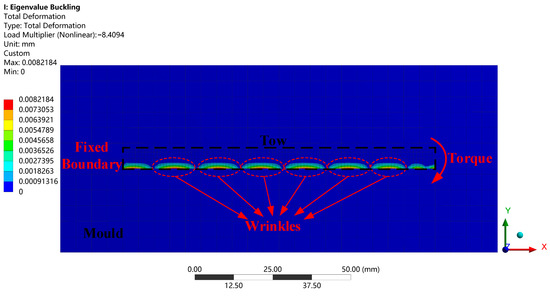 Secondly, the formation of wrinkles when the prepreg tow is laid at different angles is simulated in the post processer. The edge to be laid is set to rotate 10° around the fixed edge, and the length of the laid tow is 100 mm, and the calculated bending radius is 572.958 mm. It can be seen from Figure 10 that there are out of plane wrinkles with equal spacing distribution on the compressed side, and the buckling deflection is approximately sinusoidal, while there are no forming defects on the tensile side of the tow, which fits well with the mold. In conclusion, the distribution of defects is consistent with the theoretical model.