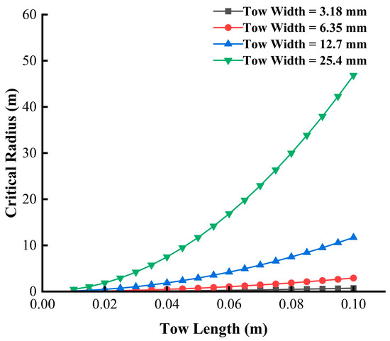 Figure 11 shows the relationship between the length of the tow with different widths and the critical buckling radius. The critical buckling radius increases with the length and is sensitive to the change in width. When the width of the tow is narrow, the change in the buckling radius with the length is small. When the width is increased to 1 inch, the increase in the laying length will easily lead to the formation of defects in the tow, such as wrinkles.