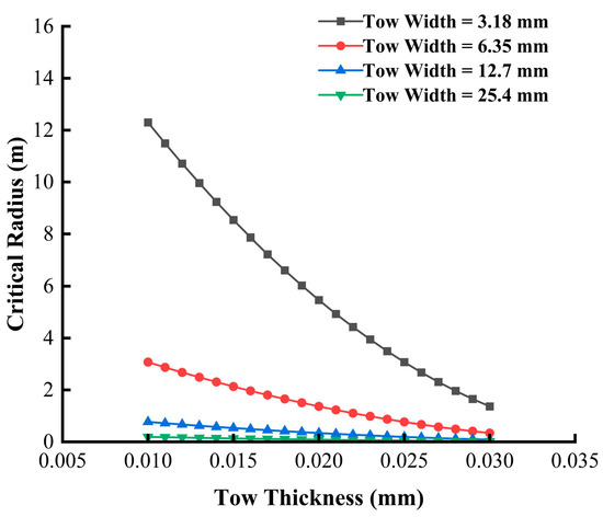 Figure 12 shows the relationship between the thickness of the tow with different widths and the critical buckling radius. With the increase of the thickness, the resistance of the prepreg tow to buckling is gradually enhanced, and the possibility of out of plane wrinkles is reduced. The thicker tow can realize large curvature bending without defects. In addition, the width of the tow still affects the sensitivity of the buckling radius to thickness.