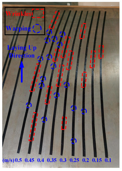 In Figure 16, different laying speeds correspond to uneven forming quality. The faster the laying speed, the shorter the contact time between the compaction roller and the tow, which leads to a poor fit between the tow and the mold. In addition, the fast velocity leads to insufficient heating temperature in the placement area and poor fluidity and viscosity of the prepreg resin, which further reduces the bonding quality. In this case, the inhibition effect of tow adhesion on wrinkle formation is very poor. The actual results are consistent with the theoretical model; that is, excessive laying speed reduces the adhesion coefficient of the tow, so that a small in-plane compression load can cause buckling, wrinkles or even wavy warping.