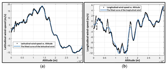 Discrete wind data and the corresponding fitted curve. (a) shows the discrete latitudinal wind data and the fitted curve of the latitudinal wind. (b) shows the discrete longitudinal wind data and the fitted curve of the longitudinal wind.