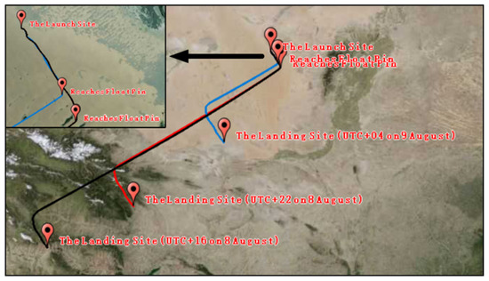 As shown in Figure 10, the straight-line distance between the launch site and the landing site was 438.405 km, and the azimuth between the launch site and the landing site was 245.6°. Moreover, the flight mission lasted for nearly 18 h. The high-altitude zero-pressure balloon flew in a large volume of airspace without a corresponding control strategy, and the trajectory took on a Z shape for this flight.