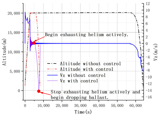 In summary, the control strategies comprised two phases. First, enforcing the active exhaust procedure allowed the balloon system to descend until the designed ballast drop altitude, and then the active exhaust process was finished. Second, it was imperative to start dropping ballast immediately at the end of the active exhaust process, which helped the balloon system reach the ground at a vertical speed close to zero.