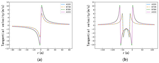 Induced velocities of different aircrafts at 174.95 kts. (a) Single vortex. (b) Twin vortex.