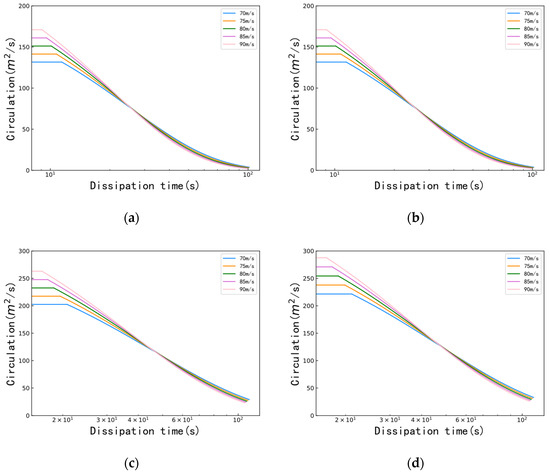 Evident from the figure, the wake-vortex evolution characteristics for all types of aircraft show a similar trend, where the higher the aircraft flight velocity, the larger the initial circulation and the longer the duration of the near-vortex stage. In the far-vortex stage, there exists a circulation value at which the dissipation times of wake vortices generated by the same aircraft at different flight velocities tend to be the same, which is called “dividing circulation” in this paper. In particular, the dividing circulation for the medium aircraft is about 75 m2/s, and the required dissipation time is about 25 s. Meanwhile, the dividing circulations of B789 and A333 are about 115 m2/s and 127 m2/s, respectively, and the required dissipation times are around 45 s. The change in flight velocity affects both the initial circulation and wake-vortex dissipation. Before reaching the dividing circulation, the larger the initial flight velocity, the larger the initial circulation, and the slower the dissipation of a wake vortex where more time is required to dissipate to a fixed circulation value. However, after reaching the dividing circulation, the larger the initial flight velocity, the larger the initial circulation, the faster the dissipation of a wake vortex, and the less the time is required to dissipate to a fixed circulation value.