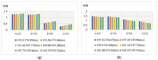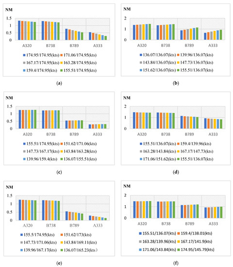 By using the minimum roll-moment coefficient of 0.048 as the critical value in the above safety index, the minimum required flight separation can be calculated. This paper analyzes several velocity variations in front and following aircrafts that may occur during takeoff and approach, and classifies them into eight categories: (1) during approach, the front aircraft decelerates while the following aircraft’s velocity remains unchanged; (2) during takeoff, the front aircraft accelerates while the following aircraft’s velocity remains unchanged; (3) during approach, the front and following aircraft decelerate with the same acceleration; (4) during takeoff, the front and following aircraft accelerate with the same acceleration; (5) during approach, the front and following aircraft decelerate, and the front one has a higher acceleration; (6) during takeoff, the front and following aircraft accelerate and the front one has a higher acceleration; (7) during approach, the front and following aircraft decelerate and the following one has a higher acceleration; (8) during takeoff, the front and following aircraft accelerate and the following one has a higher acceleration. Based on the above eight cases, the reduction in required separation between front and following aircrafts at different velocities relative to the ICAO standard were calculated, re-spectively, and the results are provided in Figure 5.