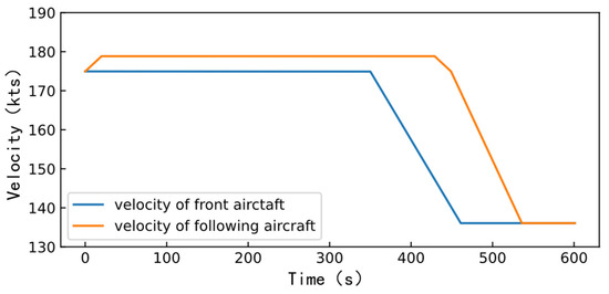 Essentially, the above-mentioned calculation results create the conditions for the realization of dynamic wake-separation reduction. Based on the variation in the flight velocity of various aircrafts in the ADS-B data of Chengdu Shuangliu International Airport, a set of velocity profiles of the CRJ-900 following medium and heavy aircrafts is constructed, before the front aircraft flies over the threshold (which is 600 s). Here, the following aircraft can adjust the separation by changing the flight velocity, as elaborated in Figure 6.