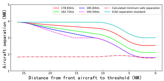 The circumstances of separation change when a CRJ-900 follows a medium and heavy aircraft throughout the threshold segment are shown in Figure 7 and Figure 8. The horizontal axis represents the distance from the front aircraft to the runway threshold, and the vertical axis represents the separation between the front and the following aircraft. The minimum separation at each position is expanded by 10% to further ensure safety, as shown by the dotted line in the figures. The legends show the flight velocities of the following aircraft after acceleration. For the whole segment, the final flight separation is the value corresponding to the vertical coordinate of each curve in the figure when the horizontal coordinate is 0. If the velocities of the front and following aircrafts remain constant, in order to maintain the minimum safety separation specified by ICAO, CRJ-900 following a medium or heavy aircraft needs to maintain a separation 1NM larger than the minimum separation specified by ICAO (3 NM for CRJ-medium, 5 NM for CRJ-heavy) at the start of approach.