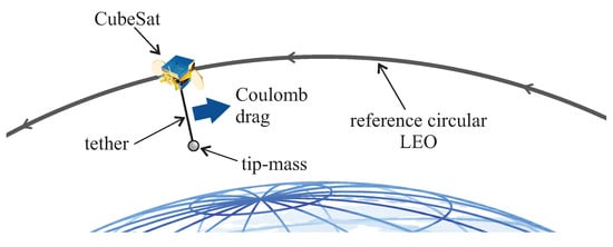 Among the proposed methods to reduce the decay time of low Earth orbits (LEO) satellites, the electrostatic plasma brake [,,,] represents one of the most promising and fascinating options, as it does not require any propellant consumption, but only a tether-unreeling mechanism and a small amount of electrical power to charge that (conducting) tether. In fact, the plasma brake (PB) generates a Coulomb drag by means of a negatively charged thin tether, which electrostatically interacts with the ionized particles in the upper layers of the Earth’s atmosphere  []. The PB tether is usually so thin that a fragment taken from it should rapidly descend into the lower layers of the atmosphere without posing a threat to other spacecraft in those regions. From a conceptual point of view, the PB uses the same physical principle as the Electric Solar Wind Sail (E-sail) [] although it is significantly smaller and less heavy because, instead of requiring an electron emitter, it uses natural charging from highly mobile electrons to maintain a negative voltage. The potential of E-sails has already been investigated in the context of a number of heliocentric mission scenarios, such as a planetary rendezvous [,,], the more challenging in situ study of the outer region of the solar system [,,], or the futuristic exploration of nearby interstellar space [,]. On the other hand, the PB could represent a very promising option for passively deorbiting a spacecraft from a LEO. In fact, passive deorbiting systems may operate without any propellant stored onboard and after deployment are much easier to control than the other (more involved) active deorbiting strategies  [,]. Among the passive methods, another interesting option comes from drag sails or similar drag augmentation devices that increase the area-to-mass ratio of the satellite [,]. Another possibility is the unreeling of an electrodynamic tether to exploit current flux and generate a magnetic field that interacts with the Earth’s magnetosphere [,]. In this context, according to preliminary estimates [], a PB could enable shorter deorbiting times than typical drag augmentation devices while requiring a power supply significantly smaller than that of an electrodynamic tether.