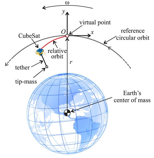 Consider a PB-based CubeSat that initially traced a circular LEO of radius r and introduced an orbital reference frame  at origin O; see Figure 3. The point O coincided with the CubeSat center of mass when the PB device was not deployed. Orbital perturbations were ignored, The y-axis was oriented radially from the Earth’s center of mass to O, while the x-axis was tangent to the reference LEO in the opposite direction of the orbital motion.