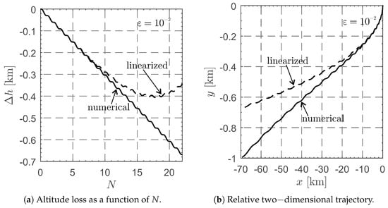 Note that the value of  increases either when the spacecraft total mass increases or when the Coulomb drag magnitude decreases, that is, when the value of the drag acceleration magnitude  falls. This aspect can be analyzed by comparing the approximate results from the analytical Equations (1) and (2) and the outputs of the numerical integration of the nonlinear equations of motion. For example, Figure 5 shows that the approximate solution differs greatly from the numerical one if , while from Figure 6, the approximate solution closely follows the solution from the orbital propagator when . In Figure 5 and Figure 6, the initial value of the PB-induced drag magnitude is  and the CubeSat initially covered a circular LEO of altitude .
