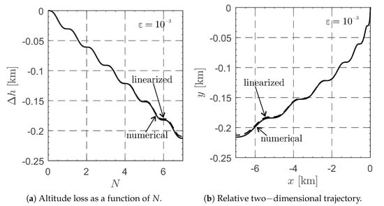 In all cases, the approximate results were compared with the solutions from the numerical integration of the (nonlinear) two-body equations of motion. The simulations were on a  Intel Core i7-10510U processor using the MATLAB ode113 solver with absolute and relative errors equal to  and maximum step size equal to 0.01 terrestrial Canonical Time Units (about 8 s). Starting from altitude , the total decay time required for the spacecraft to reach the final altitude of , corresponding to the value of the minimum orbital radius , was evaluated through an iterative process, in which  was assumed to be constant during each cycle. The number of revolutions of the rotating reference system in each cycle came from Equation (11), with , where N coincided with the minimum value of  with respect to r: