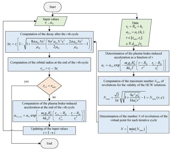 The i-th cycle was therefore characterized by a constant value of PB-induced acceleration , that is,  was approximated by a step function during the whole decay, while the satellite relative position was set equal to zero at the beginning of each cycle. This amounted to modifying the position of the virtual point with respect to which the orbital decay was evaluated at each step, by updating the value of r as