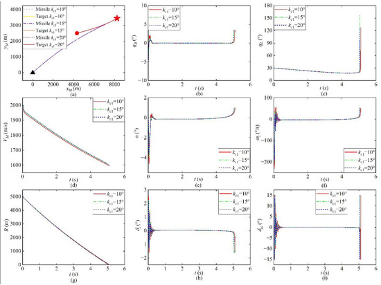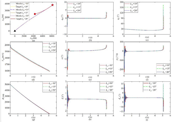 The simulation results are shown in Figure 3. Figure 3a–i show the missile and target trajectories, FOV angle, LOS angle, missile velocity, angle of attack, pitch angle rate, remaining intercept distance, rudder angle, and controller input, respectively. As can be observed in Table 3, the miss distance under the three constraints is less than 1 m. Figure 3b shows that the FOV angle does not exceed its maximum during the entire interception and the FOV constraint is assured under different FOV constraints. Moreover, the designed controller can ensure that the FOV angle converges rapidly to zero from its initial value and maintains it until the missile–target distance is very close, when it gradually diverges. However, the FOV angle is still within its maximum when the missile–target distance is close to the dead zone distance of the strapdown seeker. Figure 3d shows that the missile under aerodynamic drag achieves interception of a maneuvering target by its kinetic energy after losing thrust.