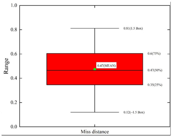 The 1000 Monte Carlo simulation results are shown in Figure 5, Figure 6 and Figure 7. Figure 5 shows the BLOS angle of 1000 simulations, which indicate that the FOV angle rapidly converges to zero from its initial FOV angle and maintains it until the missile–target distance is very close, when it slowly diverges. In addition, the FOV angle does not exceed its maximum during the entire interception. The FOV angle is still within its maximum until the missile–target distance approaches the seeker’s dead zone distance. Figure 6 shows the interception point distribution. A box plot of miss distance distribution is shown in Figure 7. It shows that all of the miss distances are within 0.9 m, the average is 0.48 m, and approximately 50% fall within an interval of 0.35 to 0.60 m. In summary, the Monte Carlo simulation results further demonstrate the robustness of the proposed IGC controller for intercepting high-speed maneuvering targets.
