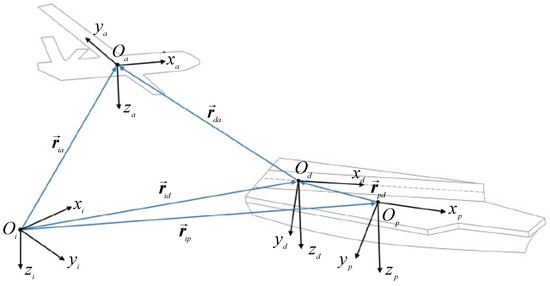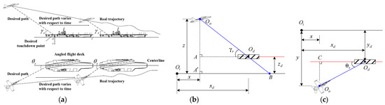 Aircraft-ship relative motion in longitudinal- and lateral-directional planes (a), in longitudinal-directional plane (b), in lateral-directional plane (c).