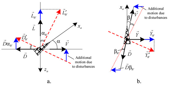 Compared to other papers, Equations (1)–(4) consider the airwake, the wind shears, the atmospheric turbulences, or the wind gusts in the expressions of the disturbances. Because these external disturbances modify the attack and sideslip angles, the aerodynamic forces have new expressions; thus, new expressions for these disturbances should be deduced.