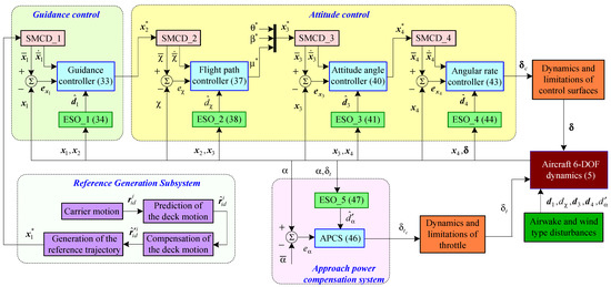 - Designing a control architecture mainly based on innovative combinations between sliding mode-based command differentiators, extended state observers, and backstepping-based controllers. Considering the influence of deck motion, airwake, and wind type disturbances, our novel ACLS has a classical configuration consisting of five control loops, i.e., guidance control, flight path angle control, control of the attitude angles, control of the angular rates, and approach power compensation subsystem. In four of the five loops, the sliding mode-based command differentiators are used to compute the virtual commands and their derivatives; then, five controllers are designed to track the generated commands. The novel ACLS is characterized by trajectory tracking capability, as well as excellent adaptability to the unexpected and even sudden changes in the state of the sea.