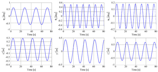 Concluding, the real trajectory of the ship deck is written as (23), where has the form (22), while the rotational matrix is expressed with (24). A simplified equation for the real trajectory of the deck can be deduced if we write , where , while the rotation matrix from the inertial reference frame to the deck body-fixed reference frame is obtained with an equation similar in type to Equation (24), in which we make the change: . For small values of the surge, sway, and heave amplitudes (i.e., waves up to 1 meter high), we can use the approximation .