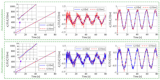 The first three mini-graphics in Figure 7 are associated to the block for the deck motion prediction (based on the recursive-least squares algorithm and detailed in Section 3.2); the target of this block (i.e., the noise decontamination of the signal associated to the deck motion) is achieved since the predicted deck position vector tends to the real deck position vector . For the deck motion prediction, it can be remarked that after less than 2 s, the curves obtained with the deck motion prediction system are superposed over to the curves associated to the real motion, which proves the efficiency of the prediction algorithm. The last three mini-graphics in Figure 7 are associated to the tracking differentiator-based deck motion compensation detailed in Section 3.3. The TD-DMC block decreases the deviation between the reference signal (i.e., the predicted deck position vector ) and the feedback signal (i.e., the signal necessary to establish the reference trajectory of the aircraft); very good tracking performance is obtained in less than 9–10 s.