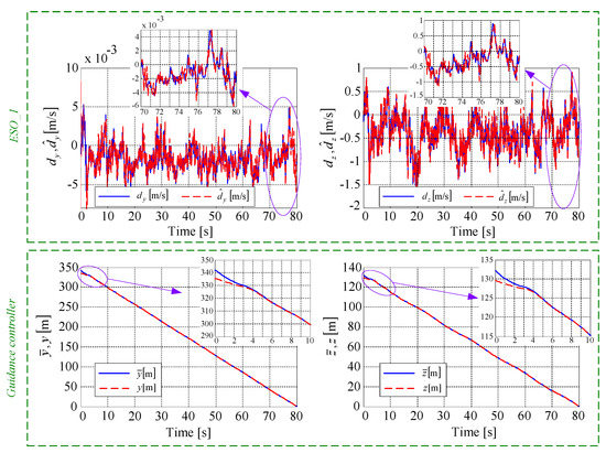 For the guidance control (Step 1), Figure 8 depicts: (i) the two components of the disturbance vector (continuous lines), as well as their estimated values (dashed lines) obtained via the first extended state observer (ESO_1); (ii) the lateral and the vertical aircraft imposed coordinates ( and ) with continuous lines, as well as their controlled values by using the backstepping-based guidance controller (with dashed lines). From the estimation point of view, ESO_1 is convergent since the components of the estimated disturbance vector tend to their real values, this being equivalent to the cancellation of the error . Thus, ESO_1 provides excellent ability in estimating the disturbances. When beginning the descent path, the airplane should track the vertical and lateral references [33]. Thus, by using the controller Equation (33), the tracking error is cancelled, the convergence being achieved in less than 4 seconds; the convergence of the guidance controller leads to the cancellation of the initial deviation between the airplane’s real and desired trajectories obtained with a block generating the reference glide slope and then by means of the sliding mode-based command differentiator SMCD_1 that achieves the convergence , also providing the time derivative . For an accurate presentation, the time histories of the vectors and are not provided here.