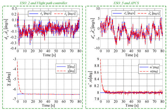 For the flight path angle control (Step 2), Figure 9 depicts: (i) the disturbance (continuous line), as well as its estimated value (dashed line) obtained via ESO_2; (ii) the imposed value of the heading angle , as well as its controlled value by using the backstepping-based flight path angle controller; (iii) the disturbance (continuous line), as well as its estimated value (dashed line) observed with ESO_5; (iv) the desired value of the attack angle , as well as its controlled value by using the backstepping-based APCS. ESO_2 and ESO_5 are convergent and cancel the estimation errors and , respectively. Additionally, by means of the backstepping-based control laws (37) and (46), the tracking errors and are cancelled in about 5 s.