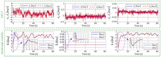 Figure 10 presents the main variables for the attitude angle control (Step 3): (i) the three components of the disturbance vector (continuous lines), as well as their estimated values (dashed lines) obtained by means of ESO_3; (ii) the real and the imposed values of the pitch angle ( and ), sideslip angle ( and ), and bank angle ( and ), respectively. ESO_3 cancels the estimation error , while the attitude angle controller uses the signals provided by SMCD_3 and the backstepping-based virtual control shown in Equation (40) to cancel the tracking error and to achieve the convergence in less than 5 s.