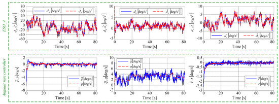 Similarly, for the control of the angular rates (Step 4), in Figure 11 depicts: (i) the three components of the disturbance vector (continuous lines), as well as their estimated values (dashed lines) observed via ESO_4; (ii) the real and the imposed values of the roll, pitch, and yaw angular rate, namely the components of the vectors and , respectively. Both and its time derivative (necessary in the controller Equation (43)) have been obtained by means of SMCD_4 that achieves the convergence , where has been computed with virtual control shown in Equation (40). We remark the convergence of ESO_4 (Equation (44)), i.e., the cancellation of the estimation error , as well as the cancellation of the tracking error .
