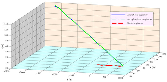 Carrier landing requires skills from the pilot because this landing process is characterized by the simultaneous movement of aircraft and carrier ship. The pilot should bring the airplane to a certain point on the ship; if it lands before the desired point, a crash into the stern is possible; on the contrary, if the landing on the carrier is too long, the pilot must take off and try again. The landing phase on carrier ships is also difficult because of the small size of the ideal landing area (e.g., width: 16.76 m and length: 12.19 m for CVN-65 Enterprise carrier). Deviation from this desired landing area (the so-called “landing box”) can lead to a collision with other aircraft parked on the carrier ship. Another difficulty of the landing process on aircraft carriers is related to the deviation angle of the runway in relation to the longitudinal axis of the ship, which is 9° [1]. Due to the restrictions caused by the optimal landing area and the short length of the runway, the aircraft should track a predefined landing path with a very small margin of error, while maintaining a constant attack angle and velocity. The efficiency of the aerodynamic surfaces is low because of the low speed and the high attack angle. The motion of the carrier deck makes the process even more difficult as the desired landing path and the point of contact move with the runway. The landing process is also difficult because the aircraft descends on a slope that is not aligned with the longitudinal axis of the runway.