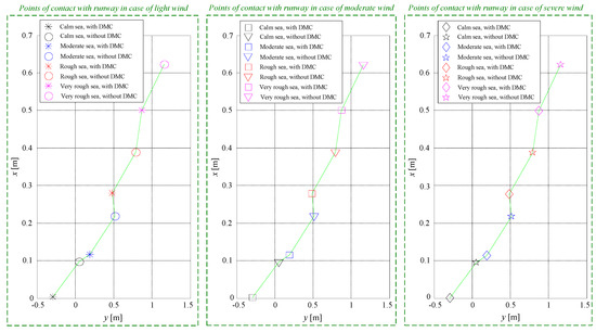 Figure 5, Figure 6, Figure 7, Figure 8, Figure 9, Figure 10, Figure 11 and Figure 12 have been drawn for moderate sea, light wind shears, light atmospheric turbulences, and light gusts. Now, it is interesting to see how the intensity of the airwake (quantified by the sea state) and the intensity of the wind influence the aircraft landing point. Figure 13 presents the distribution of the touchdown points depending on the sea state (airwake) and the intensities of the three wind type disturbances (wind shears, atmospheric turbulences, gusts). Thus, we simulated the functionality of the novel ACLS for different scenarios by considering three types of wind (light, moderate, and severe) and four types of sea (calm, moderate, rough, and very rough). The three mini graphics prove that the wind intensity influences to an insignificant extent the touchdown point, whether or not a DMC block is used. Instead, the state of the sea and the amplitude of the sea waves have a visible influence on touchdown landing point; moreover, the use of a deck motion compensation block also influences the point of contact with the runway. A quantitative comparison is detailed in Table 1. The more turbulent the sea and the higher the intensities of airwake disturbances are, the greater the longitudinal and lateral deviations from the ideal point of contact with the runway are. Moreover, the deck motion compensation block improves the landing accuracy, decreasing on average the longitudinal touchdown error by 39.38% and the lateral touchdown error by 63.76%. Thus, we conclude that the TD-DMC block significantly increases the success rate of the ACLS. The longitudinal and lateral errors have been computed relative to the ideal touchdown point (intersection of the runway center line with the third cable transversely positioned on the deck) characterized by . Even in the most unfavorable scenario (very rough sea), for the novel ACLS (Figure 4), the two tracking errors remain within an imaginary circle with radius R = 1 m, which corresponds to the best landing standards of the Federal Aviation Administration [33,48].