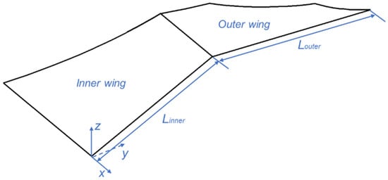 In terms of the optimization of folding wing structures, Ryu et al. [] performed an amplitude optimization after the design of a folding mechanism. Nevertheless, compared with the wing arrangement of flying creatures, many key parameters regarding the flapping wing design have been rarely studied. For example, wing folding during upstroke can obviously decrease negative lift, but does more folding area during upstroke, mean more average lift produced in a flapping cycle? Besides the factors such as flight speed, angle of attack (AOA), flapping frequency, and flapping amplitude, are there any other factors that can play an important role in the aerodynamic characteristics during flapping? Focusing on the above problems, in this paper, two wing arrangement variables, inner/outer wing proportion and mid-stroke dihedral, were selected for analysis. We considered a numerical approach by the use of unsteady three-dimensional CFD simulations. The simulation model and CFD method are introduced in Section 2. Simulation results and analytical discussion are provided in Section 3. The tendency and work point regarding maximum lift generation were found by changing both of the variables through simulations. Pressure distribution and vorticity of the flow field at specific time points were also provided corresponding to the instantaneous lift results to further discuss the lift variation of the foldable flapping wing. The main conclusions from this work are given in Section 4. The research can help to understand the wing arrangement of birds and bats issued from natural selection, and also support the future design of FWAVs.