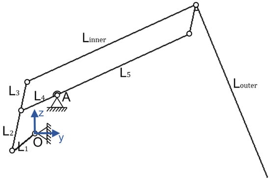 The CAD model built for simulation is shown in Figure 1. A bat-inspired wing was designed with inner and outer wing segments. The semi-span length of the wing was 0.2 m and the area of the half-wing was 0.0125 m2. The inner/outer wing proportion can be modified for different analyses. The flapping mechanism was designed based on the research of Ryu et al. [], whose mechanism could achieve an outer wing enfolding during upstroke, which could improve the average lift in one flapping cycle. The flapping angle of inner and outer wings were derived from cosine law. The schematic of the flapping mechanism is shown in Figure 2, where L1 is the input link and L4 is the output link. The inner wing and outer wing surfaces in Figure 1 adhered with Linner and Louter. The length of L1–L4 and the coordinates of points A and O are the main factors of the flapping design. In this work, we defined the coordinate of point O as (0, 0) and the position of point A as (yAO, zAO), the values of other influence factors are given in Table 1.