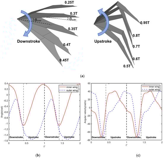 where, and are the flapping angle of inner and outer wings in radians; is the angular frequency and f is the flapping frequency. The schematic of the flapping motion is shown in Figure 3, the angle as well as angular velocity around the x-axis are defined to be positive in the anti-clockwise direction.