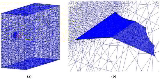 Three dimensional CFD simulation was conducted to investigate the unsteady aerodynamics of the flapping wing UAV. The simulation environment was established by using the software Ansys Fluent v18.2. A rectangular far field was applied as the computational domain. The size of the inlet and outlet was 25 × 50 and the length of the field in the flow direction was 50 . Boundary conditions of the far field and the wing surfaces were velocity inlet, pressure outlet, and no-slip wall. The symmetry boundary at y = 0 was used in order to reduce the computational cost. An unstructured grid was adopted as shown in Figure 4.