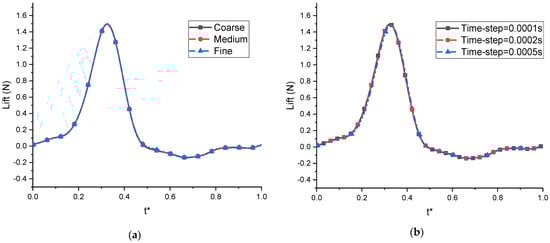 Grid and time-step convergence studies were performed. Three types of grids and three types of time-step sizes were tested. It was found that there was no obvious difference in the instantaneous lift with the three types of grids as well as time-step sizes, as shown in Figure 5. The time-averaged lift for all validation cases are provided in Table 2. The maximum difference of the average lift of all cases was only 1.22%, which is negligible in this analysis. Finally, the total number of grids we selected for all cases was around 1.7 million. The minimum grid size on the wing surface was 0.015 . The time step size 0.0002 s was selected for the unsteady simulation of the transient flapping motion.