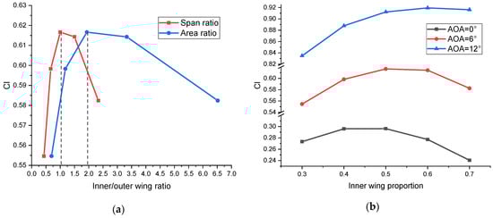 Average lift of flapping wing: (a) with respect to inner/outer wing ratio at an AOA = 6°; (b) with respect to inner wingspan proportion in different AOA.