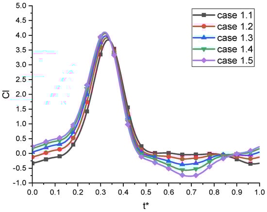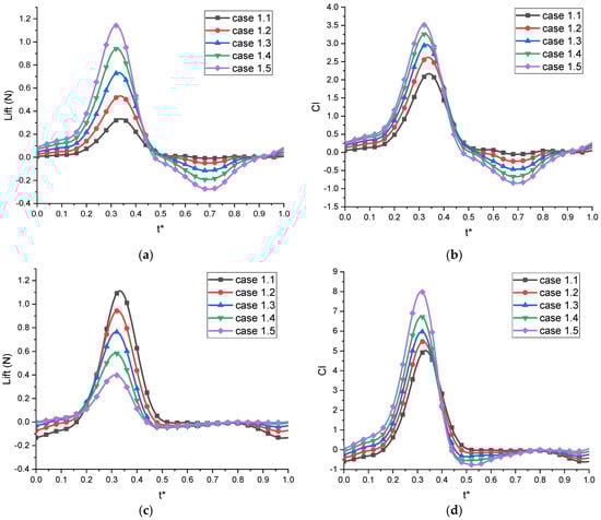 As can be seen from Figure 7, first, with the increase of the inner wingspan proportion from 30% to 70%, the time to reach the peak during downstroke was slightly delayed with the increase of the proportion of the outer wings. The maximum positive lift increases gradually with the increase in the inner wing proportion, and the maximum value (in case 1.5) increases by 6.8% compared with the minimum value (in case 1.1).
