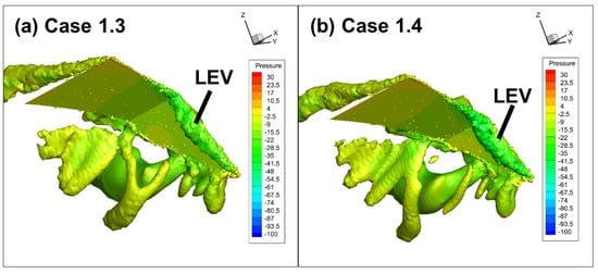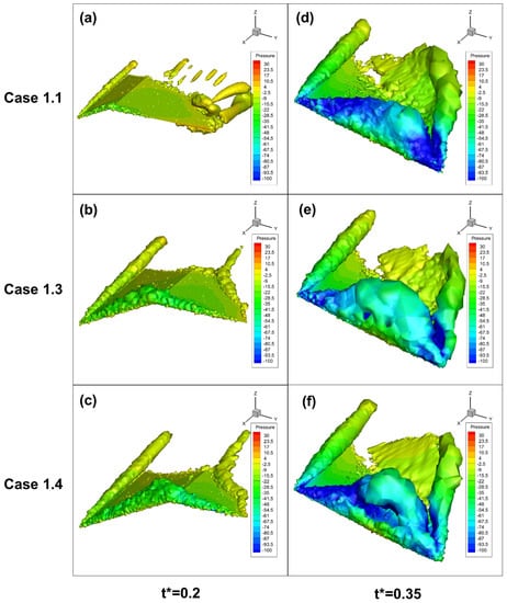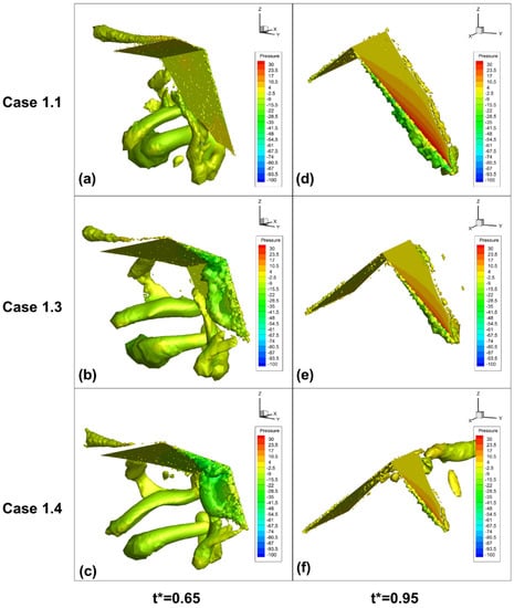 To further analyze the reason for the change of lift in one flapping cycle, the vorticity of the flow field was calculated based on the Q criterion []. Figure 8 shows the vorticity of Q = 15,000 at t* = 0.2 and 0.35. This Q value was adopted for all vortices structure plots shown in the following content because it offered the best clarity. Combined with the angular velocity provided in Figure 2c, when t* = 0.2, the inner wing begins the rapid downward flapping process, and from the corresponding Figure 8a–c it can be seen that the leading edge of the inner wing has begun to generate obvious LEV, but because the outer wing is still in the upstroke at this time, there is no obvious LEV on the upper surface of the outer wing. Therefore, because the inner wing in case 1.4 is longer, a more significant LEV structure is developed, resulting in a higher lift. When t* = 0.35, as shown in Figure 8d,f, there are still stable LEV structures on the upper wing surface of case 1.1 due to it having a shorter inner wing span. For cases 1.3 and 1.4 with a larger inner wingspan, the LEV on the outer wing has been separated into shed vortices, which can no longer provide lift increases for the flapping wing. This earlier separation phenomenon is due to the larger inner wingspan resulting in a higher linear downward flapping velocity at the inner wing tip, which will transmit to the outer wing as a translation motion as described in Section 2.2. This is why the linear flapping speed of the outer wing in cases 1.3 and 1.4 exceed the speed which can keep a stable LEV and result in the separation of the LEV. Therefore, the instantaneous lift of models with a larger inner wingspan have entered into a downward trend at this time point.