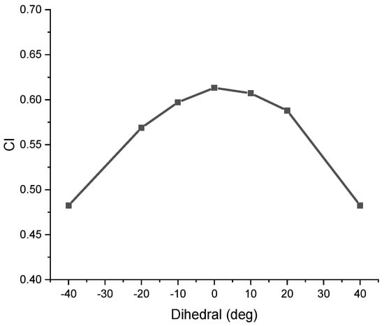 By analyzing the kinematic characteristics of the flapping mechanism, it was found that the upper and lower limits of the amplitude changed by changing the position of point A (Figure 2) while keeping the angular velocity unchanged. This section analyzed the lift characteristics of seven cases with different dihedrals δ. The number of each case and its corresponding dihedral is shown in Table 4. Results in the previous section show that the arrangement with the inner wing equipped with 50% of the span always has the maximum lift. Therefore, case 1.3 was selected as the standard case, cases 2.1–2.7 are then established to analyze the influence of the deviation of dihedrals on lift characteristics.