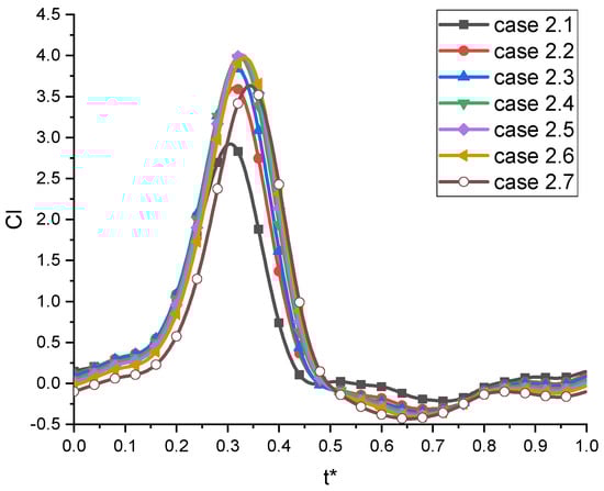 In order to further discuss the reason for the lift change caused by variation of the proportion of the inner and outer wings, considering cases with the angle of attack of 6° as example, Figure 7 gives the instantaneous lift with respect to the non-dimensional time t* (t* = t/T, where t is time and T is the flapping period). The sixth flapping cycle of the instantaneous lift in the simulation was extracted for analysis because the lift curve showed good convergence characteristics after calculating six periods. It was found that the trend of the instantaneous lift of this flapping mechanism in one flapping cycle was significantly different from that of the single degree of freedom flapping wings which normally had an instantaneous lift curve similar to the sinusoidal function in previous results [,]. The instantaneous lift curve obtained in this study had an obvious positive peak between t* = 0−0.45, but no deep negative lift trough: two small negative trough time points were observed between t* = 0.45−1 in the process of the upstroke. The lift curves of the flapping process have an obvious asymmetrical characteristic.