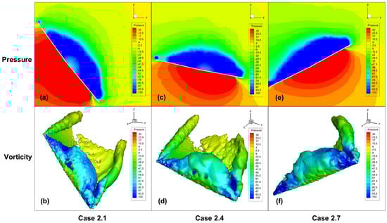 Pressure distribution and vorticity of typical cases at t* = 0.35: (a) pressure distribution of case 2.1; (b) vorticity of case 2.1; (c) pressure distribution of case 2.4; (d) vorticity of case 2.4; (e) pressure distribution of case 2.7; (f) vorticity of case 2.7.