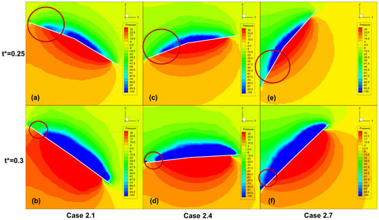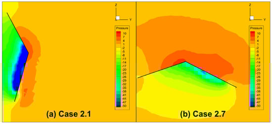Pressure distribution of typical cases at t* = 0.6: (a) case 2.1; (b) case 2.7.