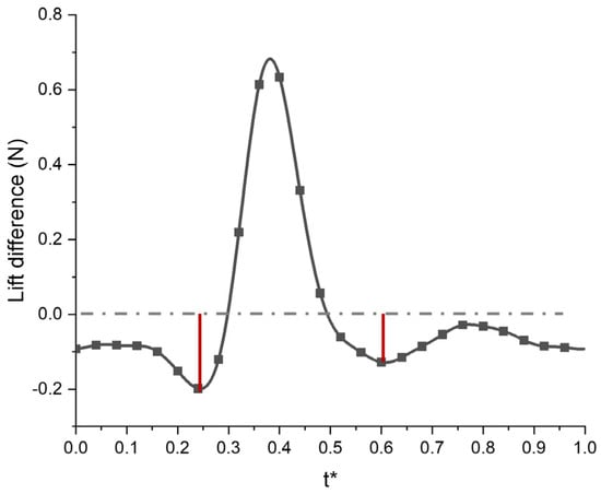 Besides of the discussion of absolute lift value, there are also some other interesting phenomena. In combination with Figure 12 and Figure 13, it was found that although case 2.7 (dihedral = 40°) had a positive lift peak 24.4% larger than case 2.1 (dihedral = −40°), the average lift of the two cases had no significant difference. Although the dihedrals of the two cases have a symmetrical appearance, it should be noted that the dihedral of the model is defined by the inner wing dihedral at the neutral position. From the view of the dihedral of the outer wing provided in Table 4, the projection area at the neutral position of the outer wing on the normal plane of lift of case 2.7 should be much larger than that of case 2.1 but resulted in no significant difference in average lift. To study the reasons, we further analyzed the lift difference by directly using the lift of case 2.7 minus the lift of case 2.1, as shown in Figure 16. It can be seen from Figure 16 that the instantaneous lift of case 2.7 is kept lower than that of case 2.1 except in the period around the positive peak (t* = 0.3 − 0.5). It is known from Figure 14 that when t* = 0.35, the reason that the instantaneous lift of case 2.7 is greater than that of case 2.1 is due to the fact that the projection area of the wing on the normal plane of lift is larger. Therefore, we only selected the other two time points: t* = 0.25 and t* = 0.6 to further analyze why the instantaneous lift of case 2.1 was larger.