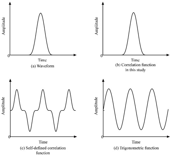 For comparison, the correlation function of trigonometric functions for the FT, the self-defined correlation function in Kong, et al. [26], and the correlation function of raw waveforms in this study are plotted in Figure 1.