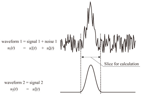 where u1(t) and u2(t) are the recorded waveforms, (t) and (t) are the signals, and (t) and (t) are the noise. It is logical that noise levels are different for different sensors, and the recorded waveform with an optimal signal-to-noise ratio can be chosen and regarded as the correlation function. In Equation (11), it is assumed that u2(t) is the waveform with the optimal signal-to-noise ratio and (t) can be ignored. Then u2(t) is regarded as the correlation function. The two waveforms can be rewritten as: