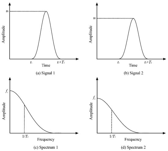 According to Equation (2), the spectra of AE waves are dependent on the source-time function S(t), and the other parameters (e.g., sensor locations and media) only affect the amplitudes of signals. For one source of the unique source-time function, the spectra of the signals recorded by different sensors are the same and the amplitudes are different for different sensors (as shown in Figure 3).