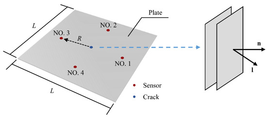 In the synthetic tests, four sensors are arranged as shown in Figure 4. An AE source (a crack of the length of 0.01 m) is located at the center of the plate, and the source–sensor distance R is 0.7 m.