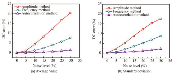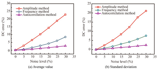 As shown in Figure 5, for a noise level of 0, the errors of the retrieved DC proportions calculated by the three methods are all 0, which indicates that all three inversion methods are suitable in cases of no noise. As the noise level increases, the errors of the inversion results increase for the three methods. However, the average values of the repeated inversion errors calculated by the autocorrelation method are more accurate than those calculated by the frequency and amplitude methods. The inversion errors of the autocorrelation method are reduced by 80% compared with the frequency method. Compared with the amplitude method, the errors of the autocorrelation method are reduced by more than 90%. The standard deviation, which indicates the stability of the repeated inversion results, also visibly improves. The standard deviation of the results calculated by the autocorrelation method is the smallest. The same phenomenon can also be observed in Figure 6, in which the symbols of the inversion results calculated by the autocorrelation method are more concentrated and closer to the true position, which indicates that the results of the autocorrelation method are more accurate and stable than those of the other two methods.