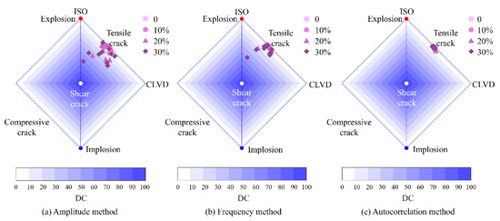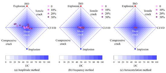 As shown in Figure 7 and Figure 8, for shear cracks, the inversion errors of the DC proportions retrieved by the autocorrelation method are smaller than those of the amplitude and frequency methods. In addition, for the source-type plots, the results obtained by the autocorrelation method are more concentrated and closer to the true values than those of the other two methods.